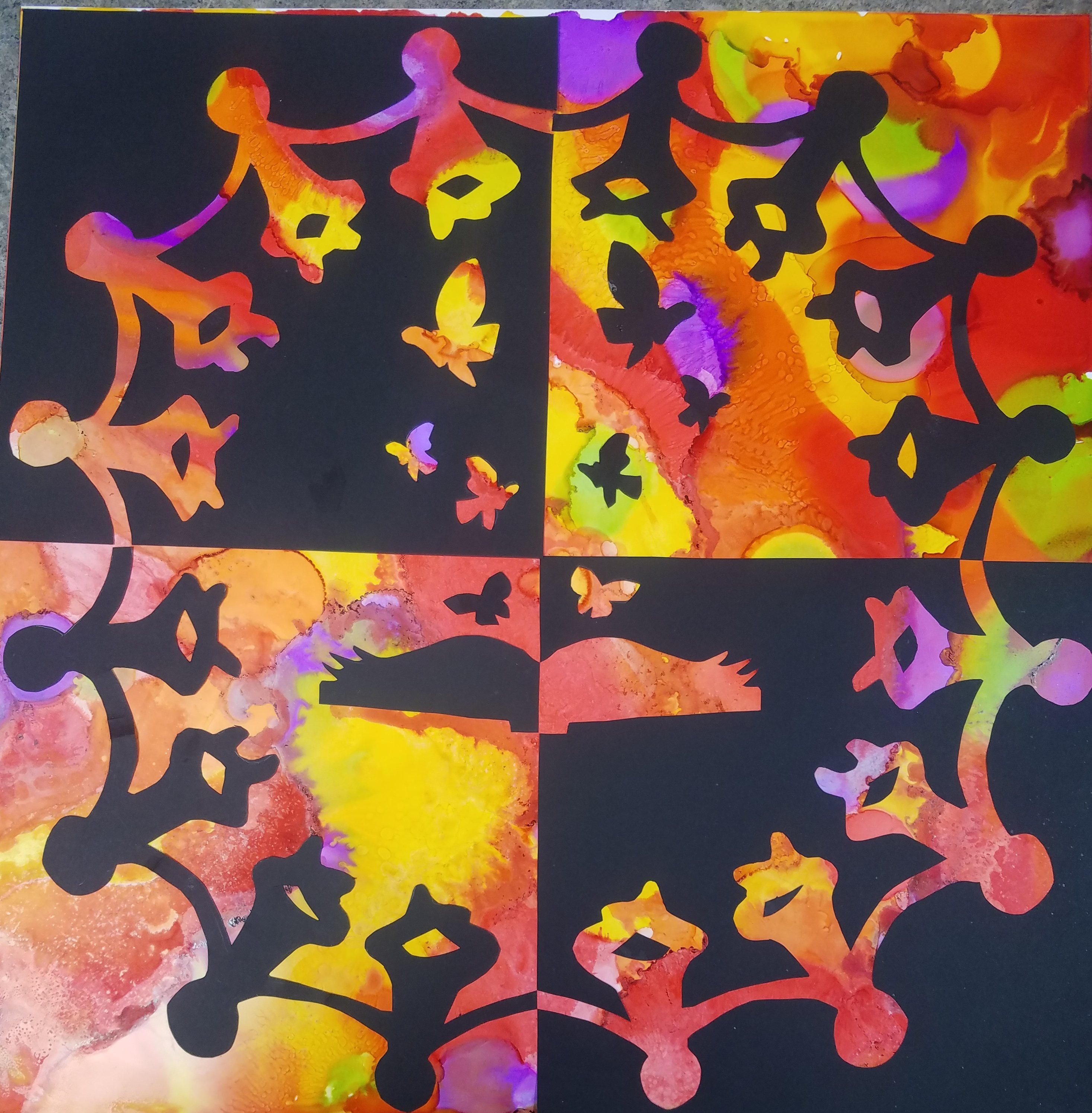 One of my favorite art exercises is to combine the traditionally black & white paper cutting design called notans with the art technique of putting alcohol inks on yupo paper. The results are always a burst of color and energy.